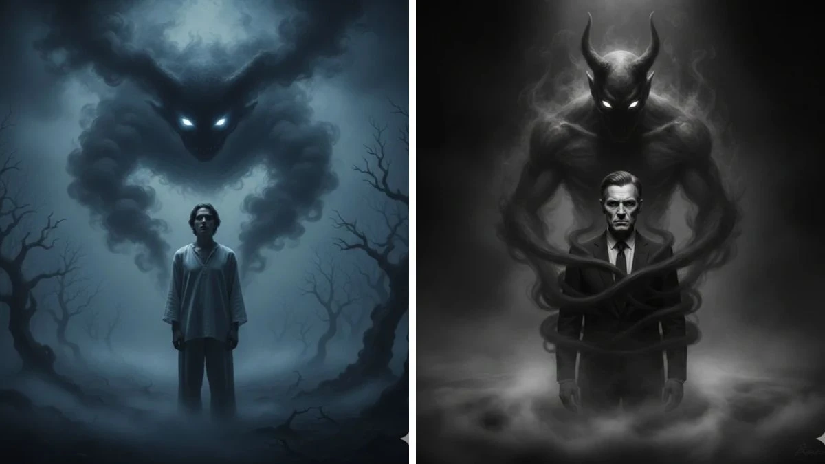 "Create a tense portrait where the subject is surrounded by dark, smoky tendrils that slowly curl around their body. The tendrils should emanate from a shadowy, smoke-like devil behind them. Use high-contrast black-and-white tones with sharp, crisp lighting on the subject’s face. The smoky entity’s glowing eyes should be the only source of light against the dark, ominous background. Add mist and fog on the ground to create depth and a sense of mystery. The subject should maintain a serious, stoic expression, giving the portrait a cinematic and unsettling look."