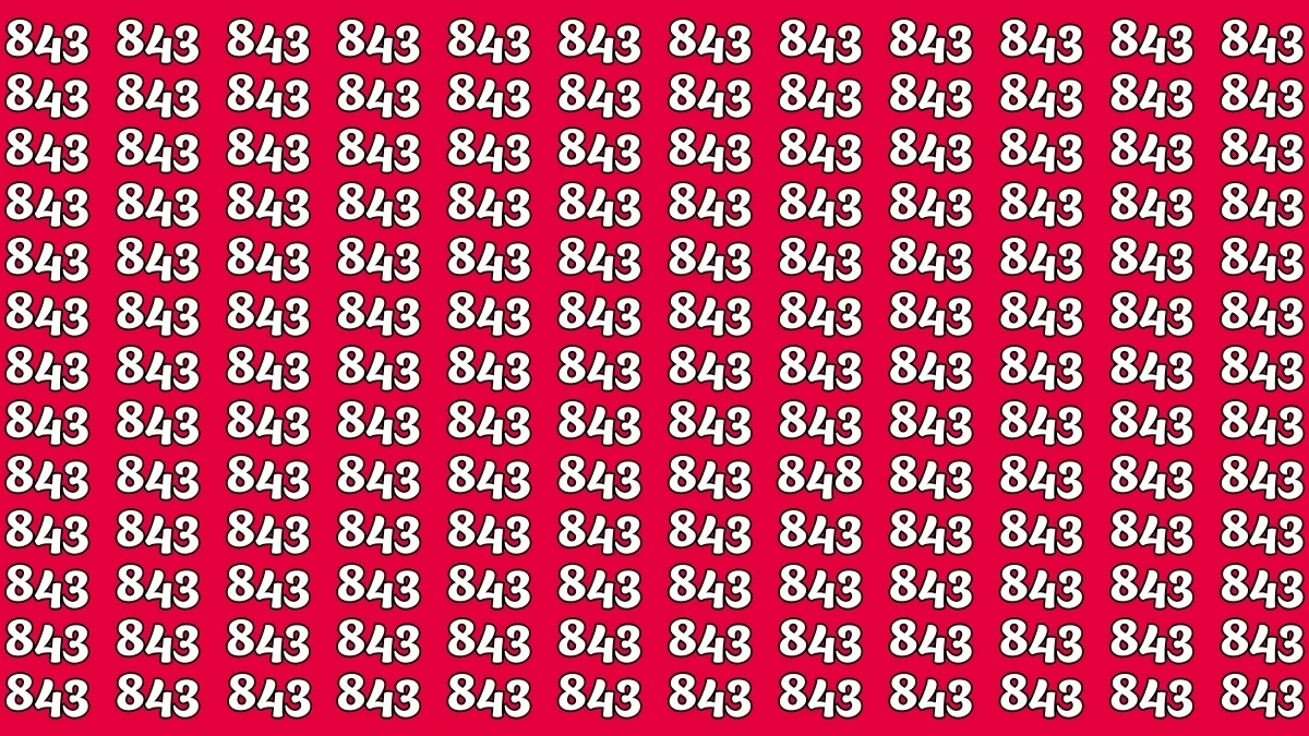 In the optical illusion, the number "848" is hidden among several "843" numbers. The challenge is to spot the subtle difference in the middle digit. Upon careful observation, "848" can be found in the bottom-left section of the image. It stands out because of the change from "843" to "848," making it the only one of its kind.